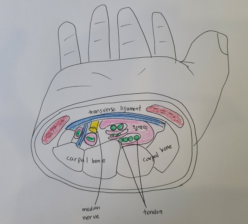 손목터널에 해당하는 부위는 transverse ligament(횡수근인대)와 carpal bone(수근골)으로 둘러싸인 부분입니다.