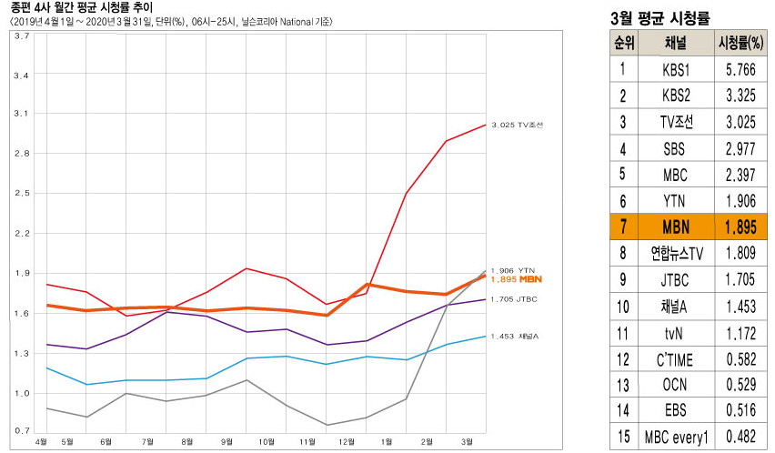 한편, 종편 시청률의 추이에서는 코로나19의 영향에 의한 특수를 모든 방송국이 누리는 가운데, 보도 전문 채널인 YTN과 연합 뉴스 TV가 개국 이래 처음으로 2%에 가까운 시청률을 기록해, 종편 채널 JTBC와 채널 A에서 상위에 랭크 인 되었습니다.