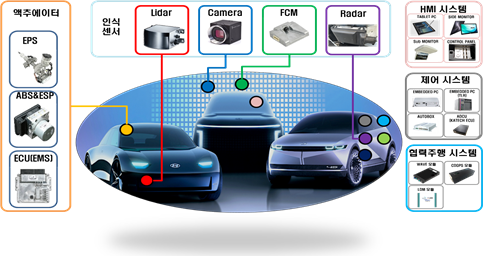 자율주행차 구조. (출처:산업통상자원부) 산업통상자원부와 과학기술정보통신부, 국토교통부, 경찰청 등 4개 부처가 24일 한국자동차회관에서 자율주행기술개발혁신사업단 발대식을 개최했다. 이날 창립이사회에서는 2021년도 사업단 사업계획 및 예산안 등을 의결했다.