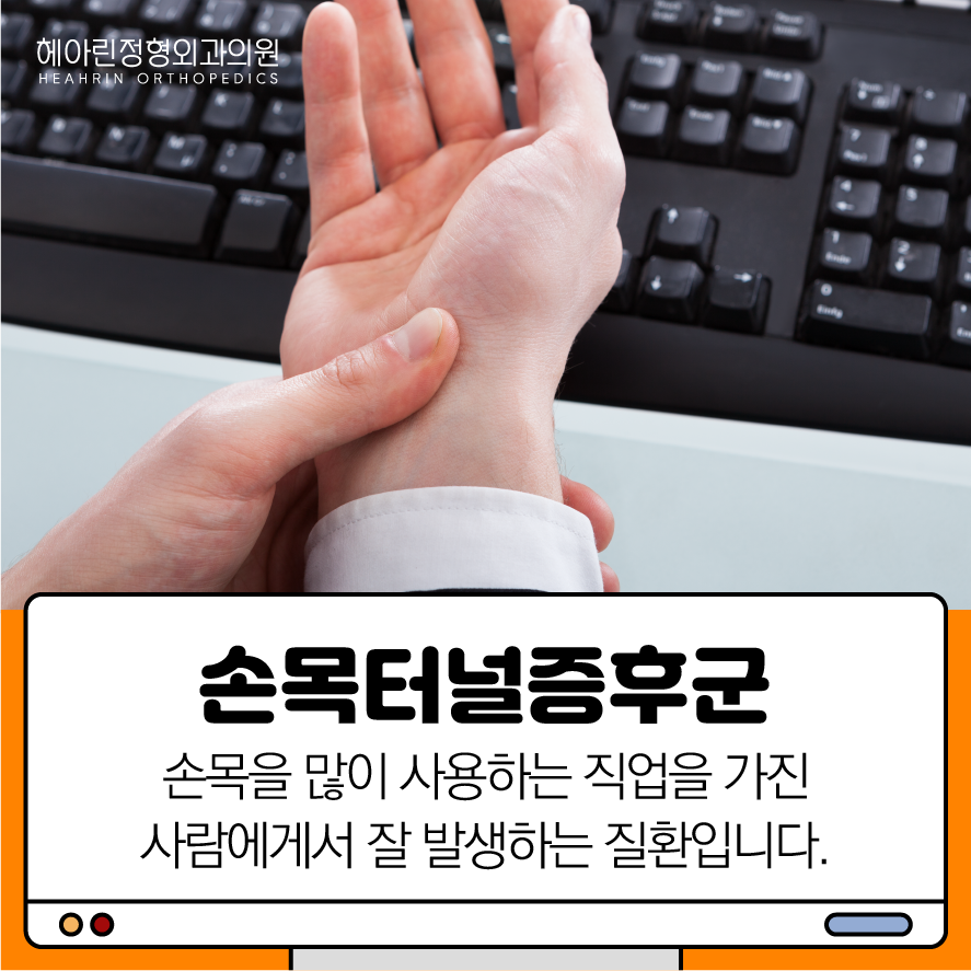 손목터널증후군 손목터널증후군은 손가락의 감각기능을 하는 정중신경이 손가락의 움직임을 담당하는 힘줄인 수근관에 눌려 생기는 질환으로 컴퓨터, 스마트폰 등을 자주 사용하거나 주부, 요리사, 디자이너, 미용사 등 손이나 손목을 많이 사용하는 직업을 가진 사람에게 흔히 발생하는 질환입니다.