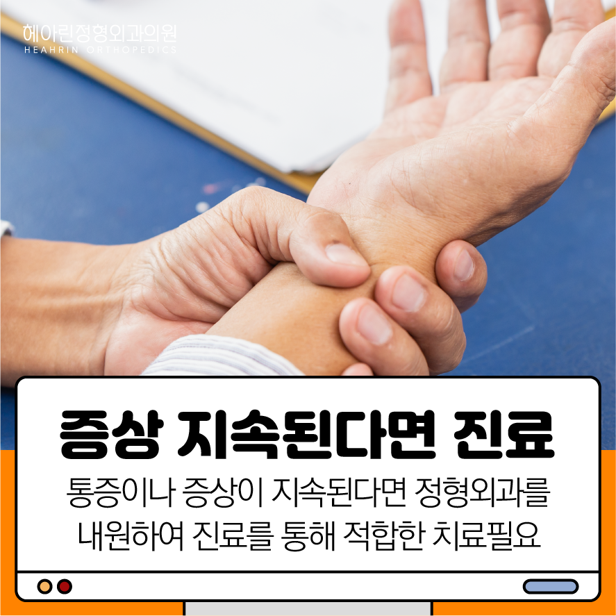 증상이 지속되면 진료가 필요한 손목 통증이나 손가락 저림 증상이 있으면 손과 손목 사용을 최대한 자제하고 충분한 휴식을 취해야 합니다. 그래도 통증이나 증상이 계속되면 정형외과를 내원하여 진료에 적합한 치료를 받아야 합니다.