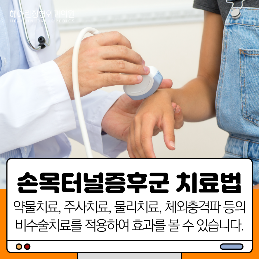 손목터널증후군 치료법 손목터널증후군 초기에는 환자의 증상에 따라 약물치료, 주사치료, 물리치료, 체외충격파 등의 비수술치료를 적용하여 효과를 볼 수 있습니다. 그 중에서도 체외충격파 치료는 통증이 유발되는 부위에 충격파를 가해 통증과 염증유발물질을 줄여 조직재생과 증상완화에 많은 도움을 줍니다.