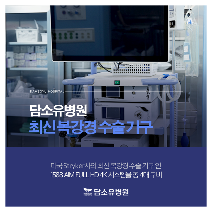 셋째, 높은 지식수준을 자랑하는 본원은 해당 질환에 적합한 시스템 구축을 위해 다방면으로 노력하고 있습니다.기구의 사양도 가장 좋은 것을 사용하기 때문에 환자의 신체적 부담은 덜어드리고 섬세한 진료를 통해 성공률을 높이도록 노력하고 있습니다.특히 수술 시 직접 사용되는 복강경 기구는 미국 스트라이커사의 최신 기구인 1588 AIM Full HD 4K 시스템을 총 4대 갖추고 있습니다.최신 기종이 구현되는 풀 HD급 화질로 복강 내를 직접 관찰하면서 최적의 조건에서 가장 안전하게 이루어지고 있습니다.