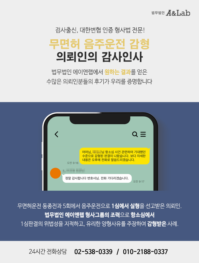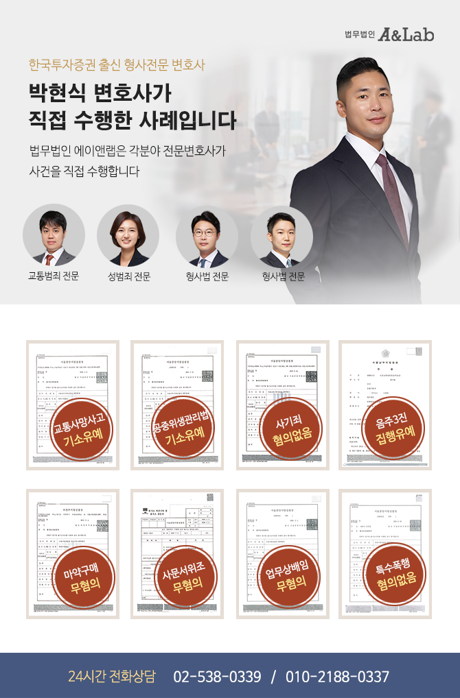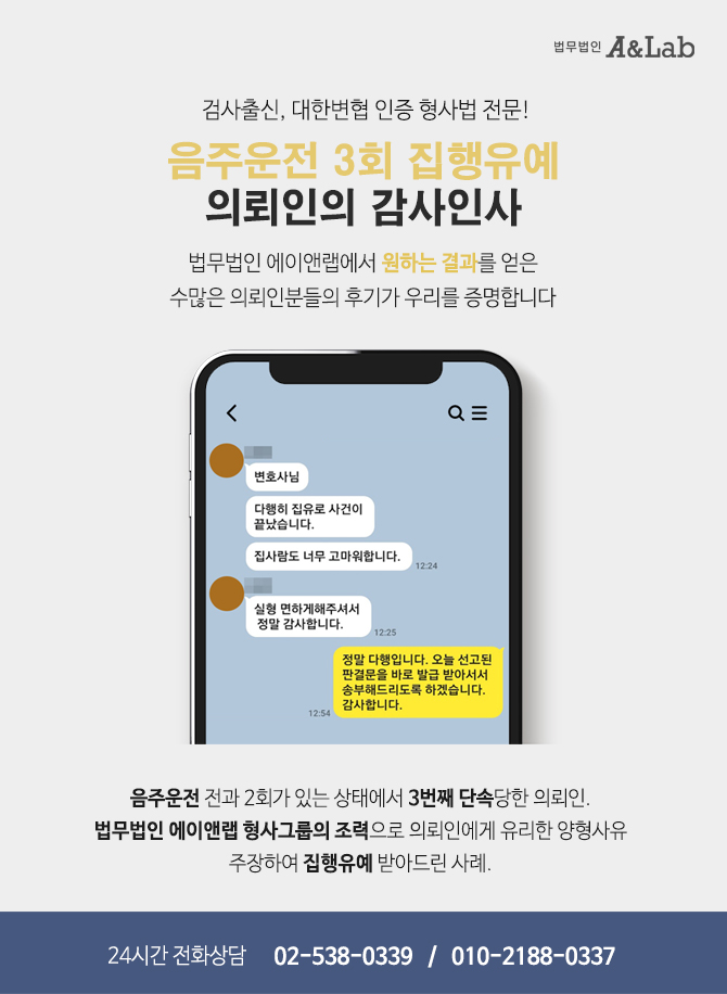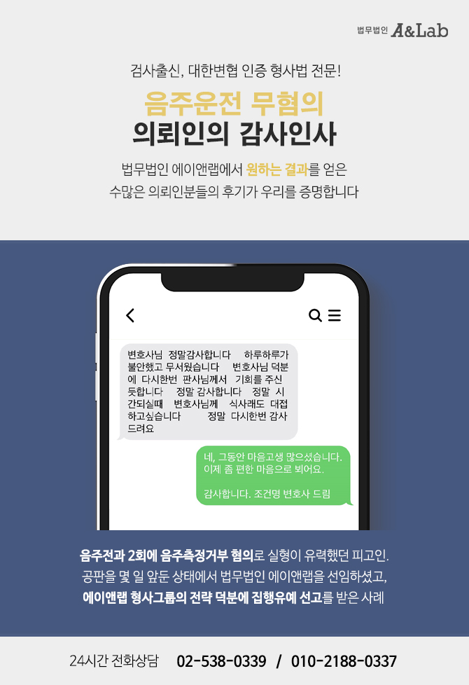 법무법인 A&랩의 고객감사 인사무 혐의, 집행유예, 기소유예까지 우리는 그동안 많은 사건을 통해 무혐의, 집행유예, 기소유예 등 음주운전 처벌 수위를 낮추는 노하우를 보유하고 있습니다.