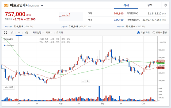 ▲ 비트코인캐시 시세 = 비트코인 캐시 시세는 현재 757,000원에 거래되고 있습니다.전일대비 +3.73%, 약 27,200원 비트코인 캐시 시세가 상승하여 하락세가 다소 이어지고 있습니다.워낙 큰 메이저 코인이기 때문에 문제가 발생하면 상승폭도 클 것 같아요.