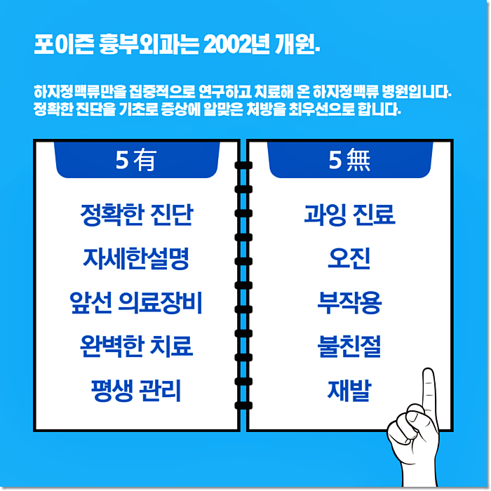 포이즌 흉부외과 하지정맥류의 치료는 유행이 아닙니다. 경험과 실력이에요. Care of varicose vein is not trend, must experience and skill 1개? 정맥에 존재하는 판막부전 및 혈관확장 등의 이유로 정맥혈이 정상방향으로 흐르지 않고 역류하여 나타나는 혹을 말한다. Read more 하지정맥류 진단법! 하지정맥류 초기의 경우 간단한 신체검사만으로 가능하나 자각증상이 동반될 경우 진단기기를 이용한 검사를 시행합니다. Read more POISO … veinclinic.co.kr
