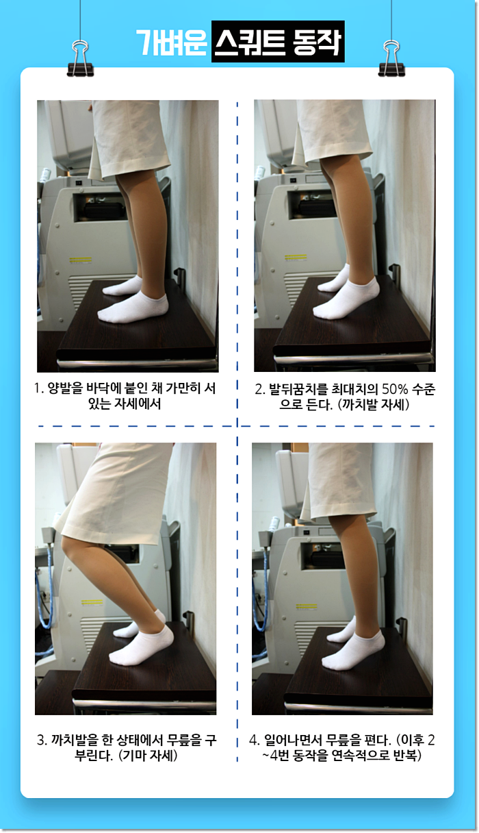따라서 무리한 운동을 바로 시작하는 것보다 가벼운 근력 강화 운동(스쿼트, 스카이 자전거 등)에 비중을 두고 지속적으로 하는 것이 효과적입니다.