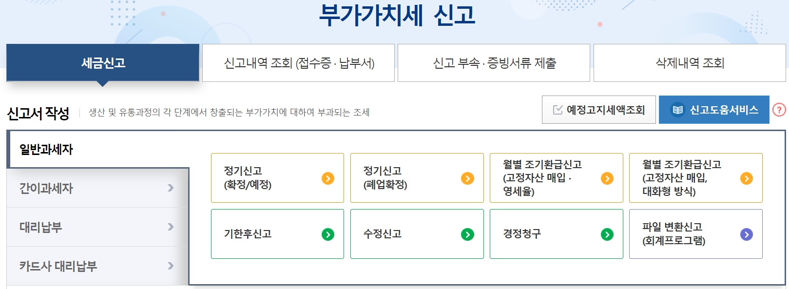 간이과세자 > 정기신고(확정/예정)를 클릭해주세요. 사진에는 잘려 있지만 오른쪽에 뭔가 대화형 방식으로 하는 것도 보였어요.(무시)