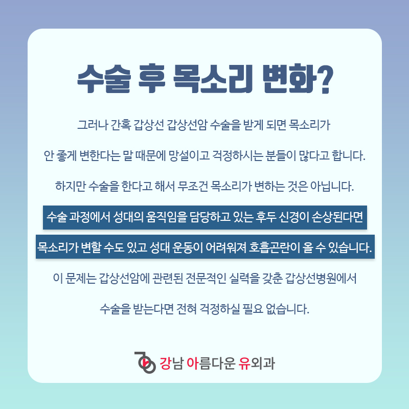 하지만 가끔 갑상선암 수술을 받으면 목소리가 나빠진다고 해서 고민하시는 분들이 많대요하지만 수술을 한다고 해서 목소리가 변하는 것은 결코 아닙니다.