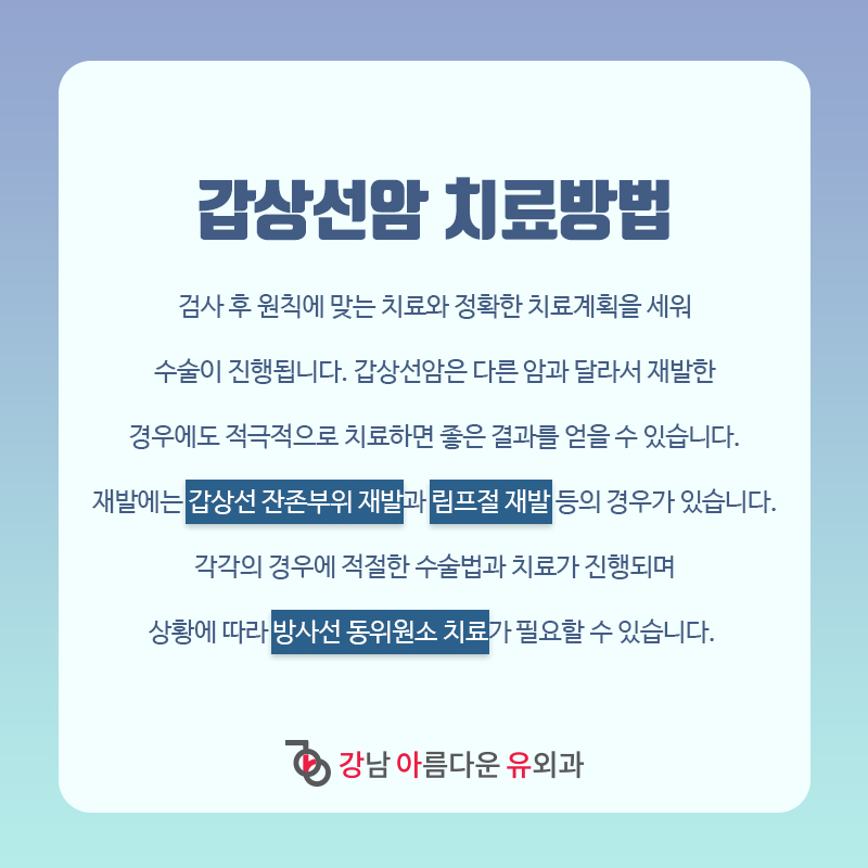 검사 후 원칙에 따른 치료와 정확한 치료 계획을 세우고 수술이 진행됩니다.갑상선암은 다른 암과 달리 재발한 경우에도 적극적으로 치료하면 좋은 결과를 얻을 수 있습니다.