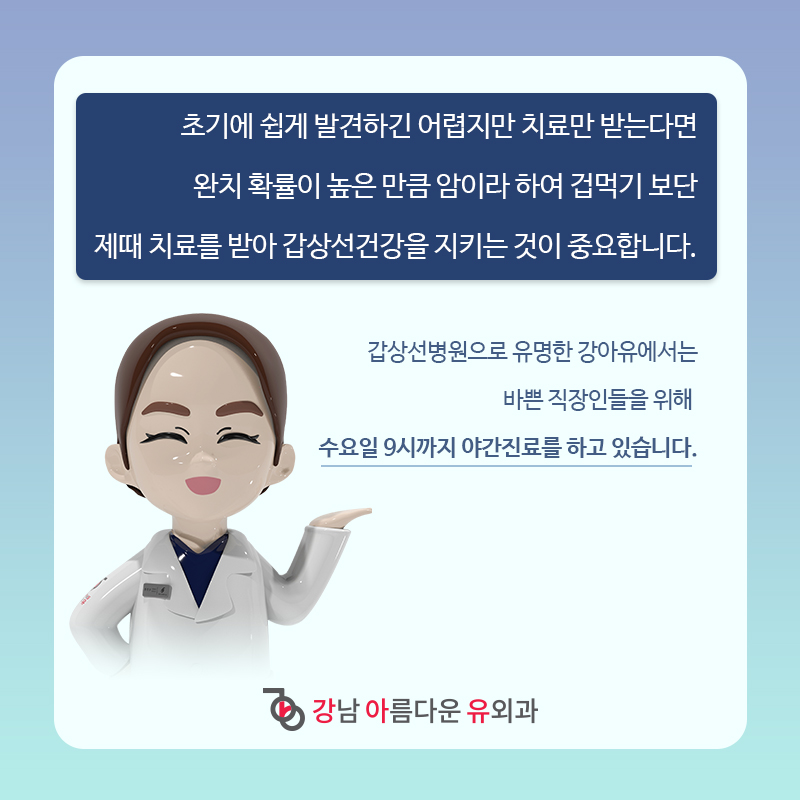 오늘은 강남의 아름다운 유방 외과 병원에서 갑상선암에 대해 알아보았습니다.초기에 쉽게 발견하기는 어렵지만 치료만 받으면 완치 확률이 높은 만큼 암이라기보다는 제때 치료를 받아 갑상선 건강을 지키는 것이 중요하다고 말씀드리고 싶습니다.갑상선 병원으로 유명한 개젖은 바쁜 직장인을 위해 수요일 9시까지 야간 진료를 하고 있습니다.