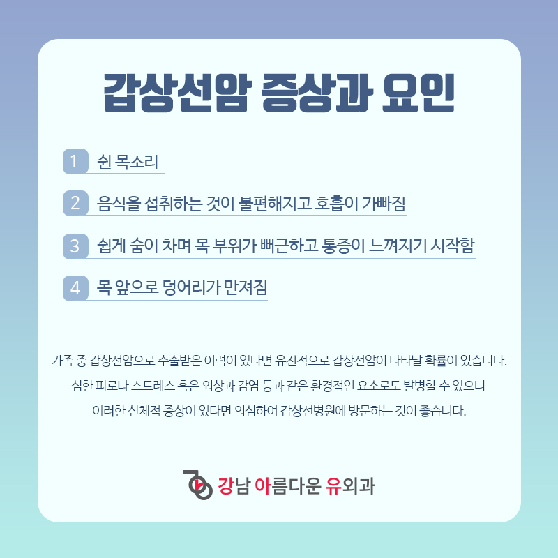 또는 목 앞에 덩어리가 만져지고 특히 가족 중에서 갑상선암으로 수술을 받은 경력이 있다면 유전적으로 갑상선암이 나타날 확률이 있습니다.