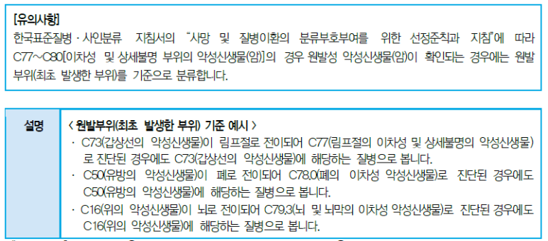 예시를 보면 유방암이 폐로 전이돼서 폐암도 같이 확인된 경우 폐암이 원전이면 C34코드가 부여되지만 폐 전이는 2차성 악성 신생물이기 때문에 C78.0(C780)코드가 부여되는 겁니다.이 때 유방암에서 전이되었기 때문에 유방암 기준으로 보상 처리를 합니다.
