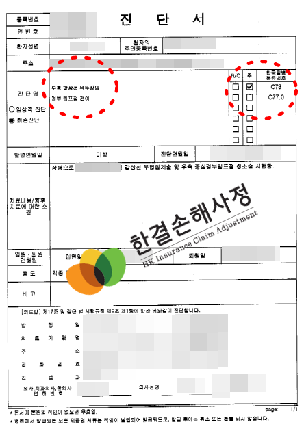 환자는 보험금 청구를 하였으나, 앞서 언급한 원전 암 보상규정이 약관에 명시되어 있었기 때문에 2차성 악성 신생물 진단코드에 해당하는 C77 코드는 원전 부위 기준으로 처리된다는 내용으로 C73, 갑상선의 악성 신생물 기준으로 보험금 처리를 받아 종결하였습니다.