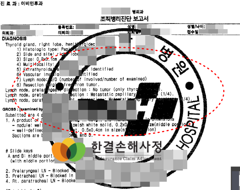 병리과에서 시행된 조직병리진단 보고서에는 오른쪽 갑상선 유두암 진단을 받은 내용이 확인되었으며, 림프절 전이도 함께 확인되었습니다.다발성 전은 아니지만 갑상선 암 전이 판정을 받은 내용이 병리 검사 결과에서 명확하게 확인됩니다.
