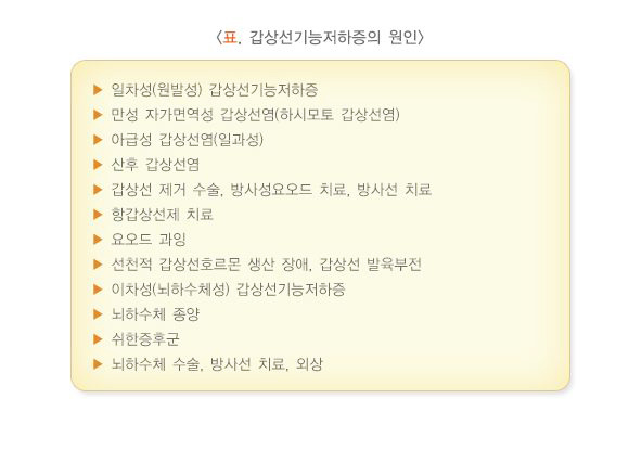 갑상선 기능 저하는 갑상선 자체 이상에 의한 1차성 갑상선 기능 저하증과 갑상선을 조절하는 호르몬 분비하는 뇌하수체라는 기관의 이상에 의한 2차성 갑상선 기능 저하증으로 나뉩니다.