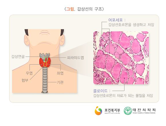 갑상선은 목의 앞부분에 위치한 내분비 기관으로 뇌에 있는 뇌하수체에서 분비되는 갑상선 자극 호르몬의 신호를 받아 갑상선 호르몬을 만들어 내는 일입니다. 갑상선에서 생성되는 갑상선 호르몬은 신체의 대사속도조절 역할을 하는데, 이 갑상선 호르몬에 기능적으로 문제가 생겨 발생하는 질환을 크게 갑상선 기능 항진증과 갑상선 기능 저하증으로 구분합니다.
