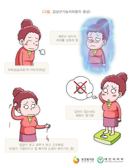 갑상선 기능 항진증은 갑상선 호르몬을 지나치게 분비해서 발생하는 것으로, 음식을 많이 먹어도 체중이 감소하고 맥박이 빨라지며 땀을 많이 흘리게 됩니다. 한편 갑상선 기능 저하증은 갑상선 호르몬이 생성되기 어렵고 체내에 갑상선 호르몬이 정상보다 낮거나 결핍되어 있는 것을 말하는데, 몸이 잘 붓고 둔해지고 피부가 거칠어지고 추위를 타는 증상이 나타납니다.