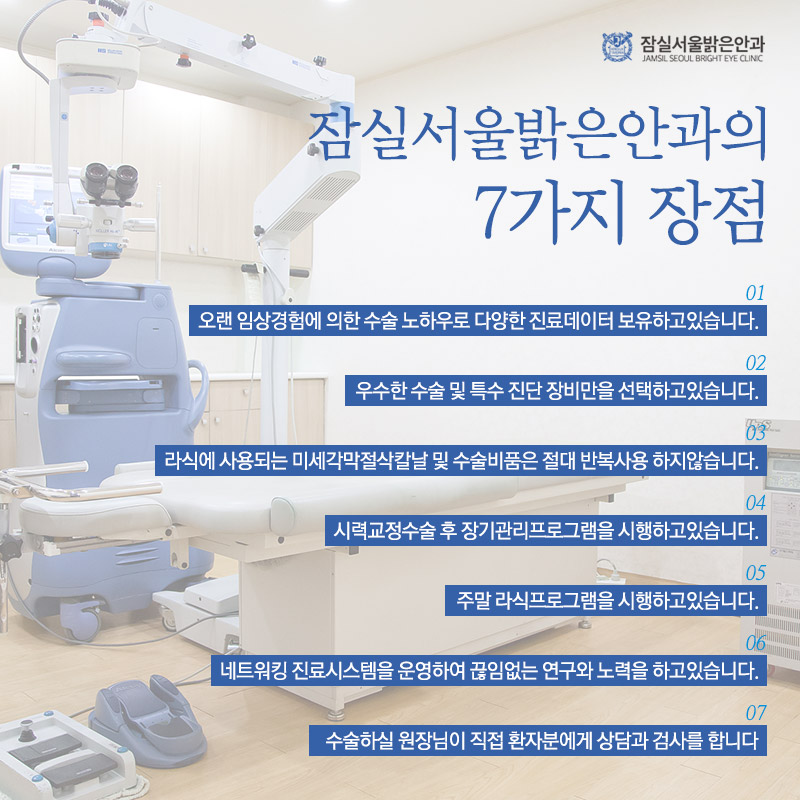 본원은 모두 서울대학교 출신 의료진이 진료하고 있었습니다 10년 이상 변하지 않고 진료하고 있기 때문에 안심하셔도 됩니다. 노안, 백내장 외에도 라식, 라섹, 드림렌즈 등도 진찰을 받고 있었습니다. 또한 저희 병원은 15년 이상 석촌역의 눈앞과 같은 자리를 지켜왔습니다. 지하철역 바로 앞에 위치하여 대중교통을 이용해도 편리하게 내원할 수 있었습니다.