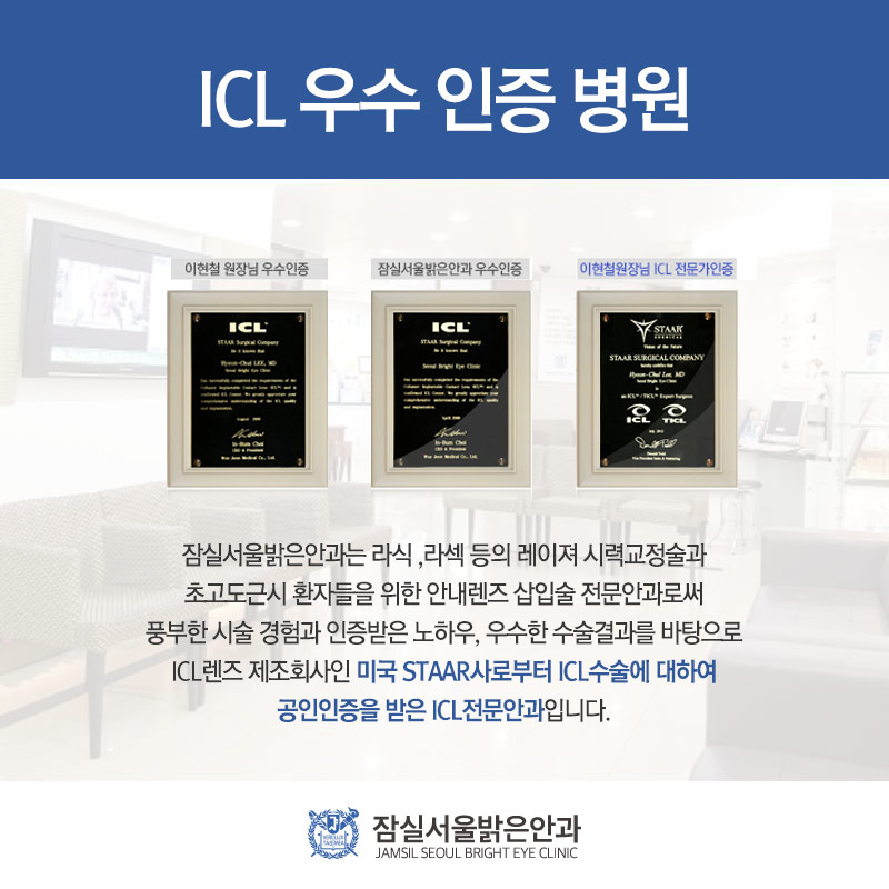 풍부한 임상 경험과 노하우, 해부학적 지식을 갖추고 있어 ICL 렌즈 업체에서 공인 인증을 받기도 했습니다. 가족을 치료한다는 마음으로 정직하게 진료하고 있으니 내원하셔서 진료를 받으시고 눈건강을 돌봐주시기 바랍니다.