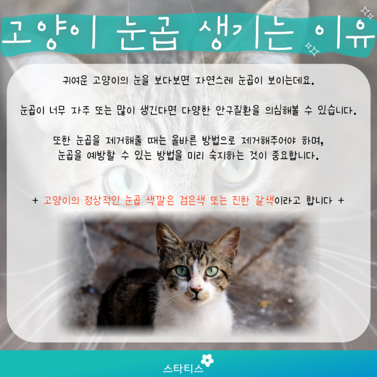 눈 자체의 질병인 눈 자체의 문제로는 우선 눈의 상처를 들 수 있습니다.어떤 원인으로 각막이 손상되면 염증으로 인한 농성 눈곱과 함께 눈물 분비가 증가합니다.얕고 가벼운 상처라면 며칠 점안하면 치료되지만 깊은 상처나 강한 감염을 일으킨 경우 치료에 시간이 걸리거나 상처 자체는 낫더라도 흔적으로 눈이 하얗게 흐려질 수 있습니다.이 밖에 결막염도 백~농성 눈곱을 동반하지만 고양이 결막염의 경우 위 감기 증상인 경우가 많습니다.또한 백내장으로 염증이나 감염을 병발하는 경우에도 눈곱이 생길 수 있습니다.