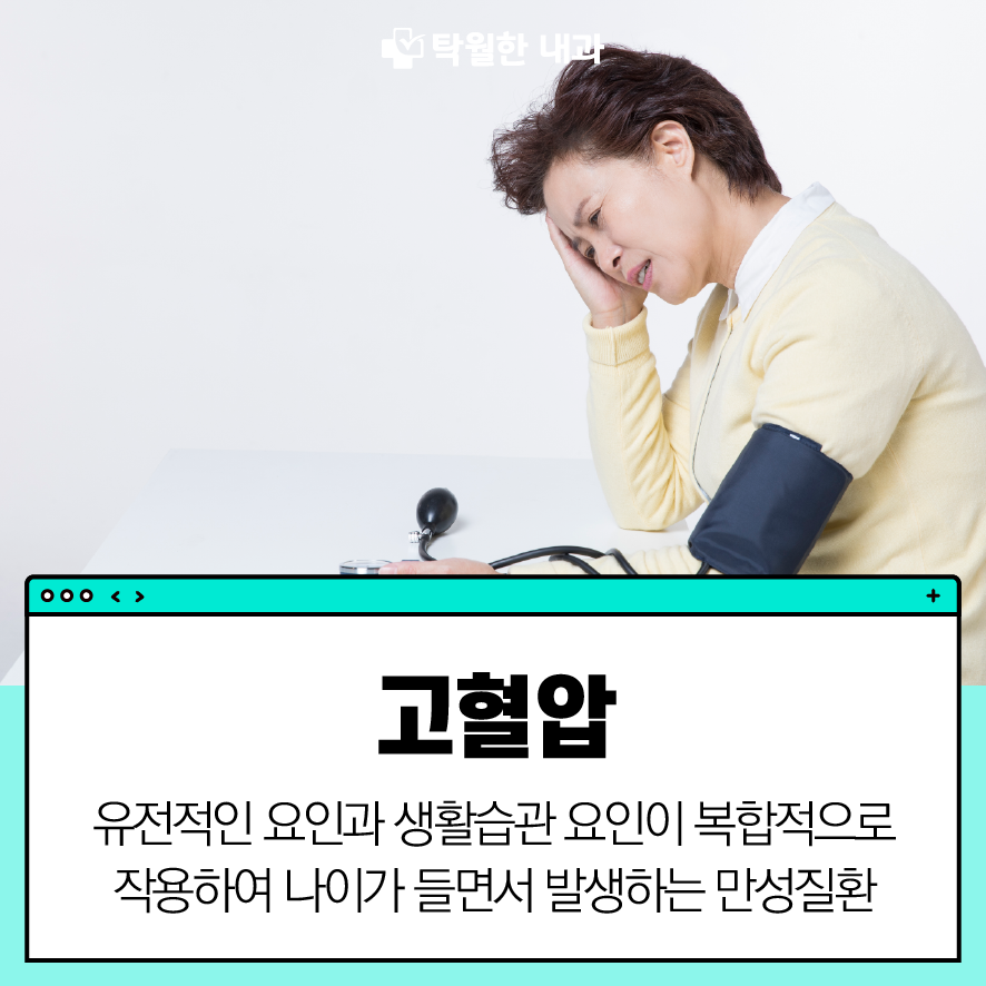 고혈압, 고혈압은 유전적 요인과 함께 생활습관요인도 복합적으로 작용하여 나이가 들면서 발생하는 만성질환입니다.
