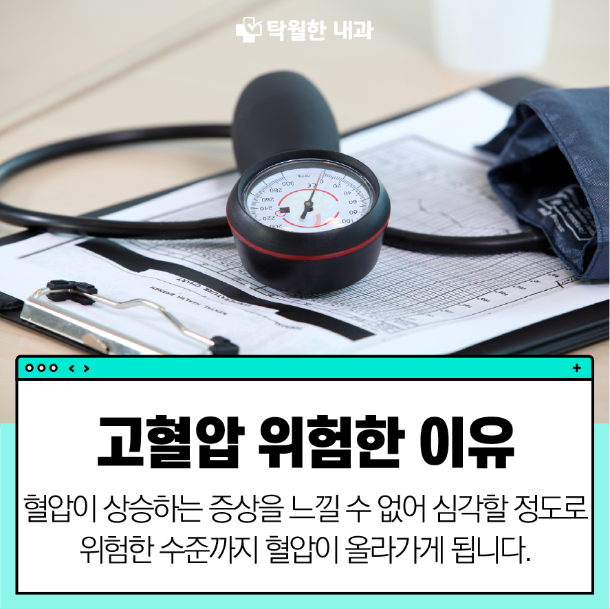 고혈압 위험한 이유→혈압 상승의 증상이 느껴지지 않기 때문에 대부분 혈압이 중증으로 위험 수위까지 오를 때까지조차 증상이 없을 수 있습니다. 혈압이 높은 상태로 조절할 수 없으면 혈관 안쪽에 노폐물이 쌓여 혈관이 좁아지거나 막히는 심장·뇌혈관 질환이 발생할 수 있습니다.
