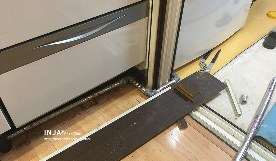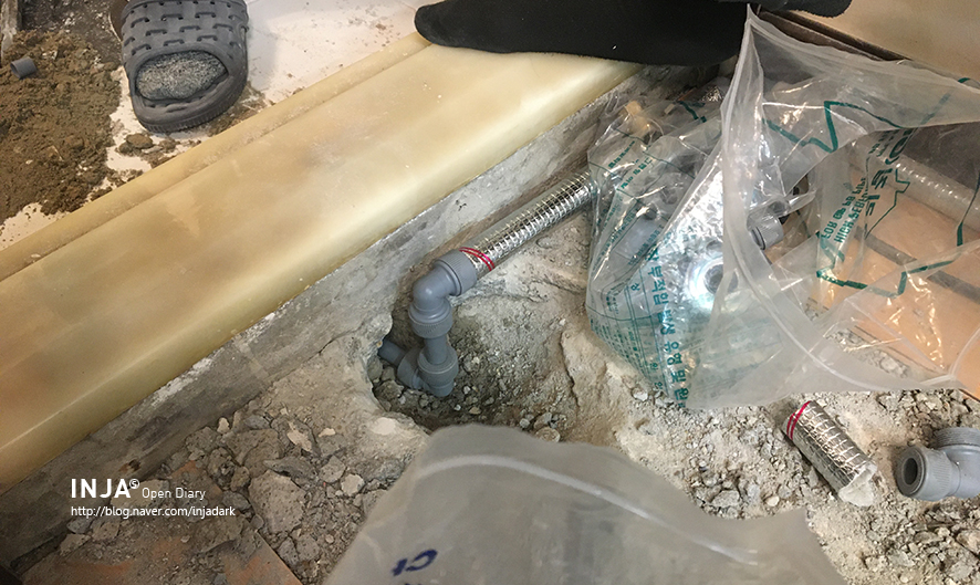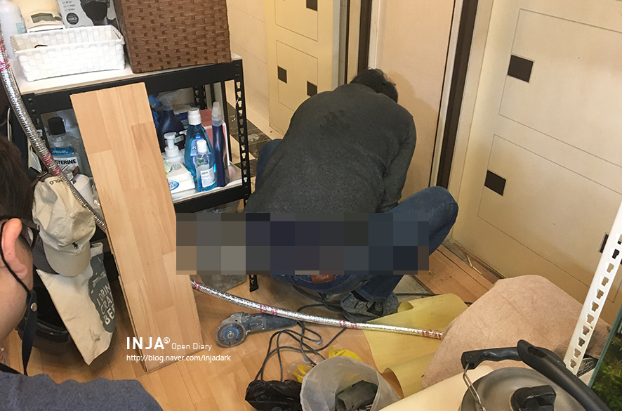 화장실 들어가는 공간 작업 중. 싱크대 쪽 배관을 분리 후 화장실 들어가는 배관 작업만으로 완료.