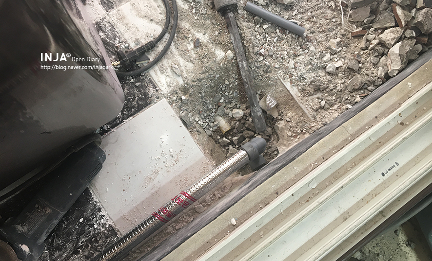 잠시 작업을 중단하고 사장님과 상의했어요.일단 강바닥을 다 뜯어내면 공사시간도 걸리고 또 그걸로 인해서 다른 준비도 해야 할 것 같은데 준비도 안 돼 있고.