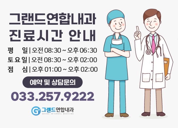 그랜드 연합내과는 평일 오전 8시 30분부터 오후 6시 30분까지 진료하고 있으나, 평일 시간이 없으신 분들은 토요일을 이용하여 진료하시기 바랍니다. 춘천당뇨 춘천고혈압 춘천고지혈증 등 자세한 사항은 아래 배너를 통해 문의하시면 빠르고 친절하게 답변해 드립니다.