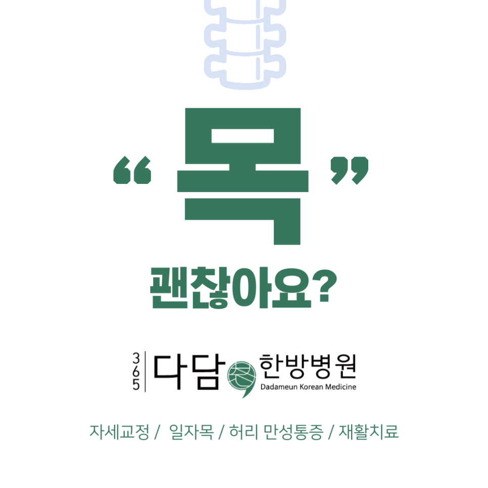 춘천 365다담 한방병원에서는 1:1 친절한 상담과 양, 한방의 협진을 통해 질병원인을 정확히 파악하고 전문적인 도수치료와 추나요법을 통해 목, 요추디스크, 귀목교정 등 관련 질병을 전문적이고 섬세하게 진료합니다.우리 몸은 한번 아프면 회복하는데 오랜 시간이 걸리기 때문에 더 악화되기 전에 더 관리하고 신경 쓰는 것이 중요합니다.