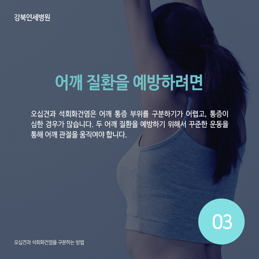 어깨의 병을 예방하려면 오십견과 석회화건염은 어깨의 통증을 구별하기 어렵고 통증이 심한 경우가 많습니다. 양쪽 어깨 질환을 예방하기 위해서는 꾸준한 운동을 통해 어깨 관절을 움직여야 합니다.