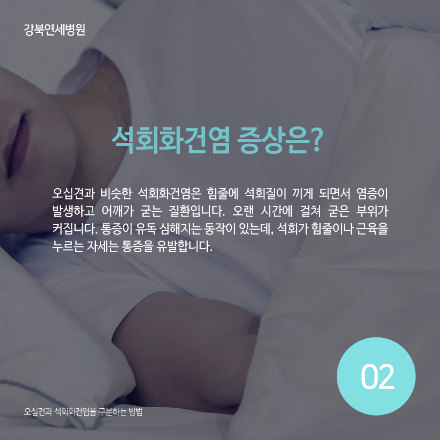 석회화건염 증상은?오십견과 비슷한 석회화건염은 힘줄에 석회질이 생겨 염증을 일으켜 어깨가 굳어지는 질환입니다. 오랜 시간에 걸쳐 굳어진 부위가 커집니다. 통증이 특히 심해지는 동작이 있는데, 석회가 힘줄과 근육을 누르는 자세는 통증을 유발합니다. 예를 들어 침대에 누우면 어깨에 체중이 실려 석회가 힘줄을 자극합니다. 또한 팔을 들어올리는 것이 쉽지 않고 사용하기 불편해 집니다.