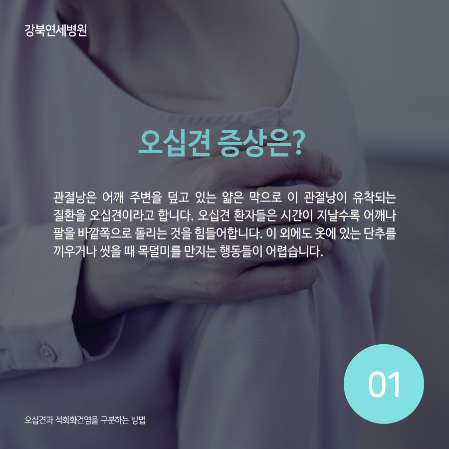 오십견 증상은?관절낭은 어깨 주변을 덮고 있는 얇은 막으로, 이 관절낭이 유착하는 질환을 오십견이라고 합니다. 오십견 환자는 시간이 지날수록 어깨와 팔을 바깥쪽으로 돌리는 것이 힘듭니다. 그 외에도 옷에 있는 단추를 끼우거나 빨 때 목덜미를 만지는 행동이 어렵습니다.