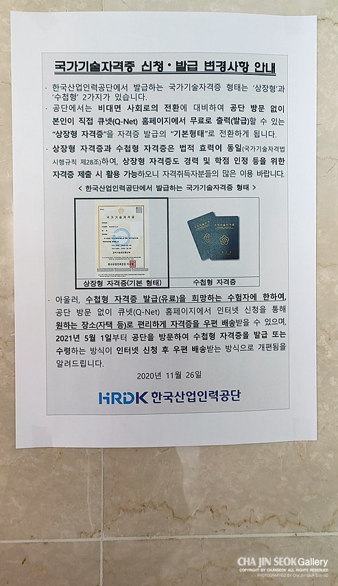 ▼ 큐넷 홈페이지 지원서 접수 국가기술전문자격 원서접수 신청 합격자/답안발표 개인득점 조회 및 합격자/답안발표자격증 신청 상장형·수첩형자격증 발급시험일정 안내 국가기술·전문자격시험일정 자격정보 응시자격자가 진단원서접수 현황 확인서 신청 응시자 준비물 자료실 환불정보 원서접수 중인 시험공지자격제도 시행출제 서비스 개선 고객지원 1644-8000(유료) 평일: 09:00~18:00(월~금) 휴일: 토, 공휴일 휴무입니다. 지부/지사 연락처는 처음 방문하셨나요? 큐넷 서비스를 미리 체험해 보고 사이트를 쉽고 빠…www.q-net.or.kr 자격증은 #상장형과 #수첩형이 있고 #상장형 발급을 홈페이지에 신청했지만 사진이 등록되지 않은 <오래된 자격증의 경우 공단에 직접 방문 신청해야 함>은 팝업이 나와 어쩔 수 없이 #한국산업인력공단 경기북부지사에 방문하기로 했다.(현재는 우편 배송 가능)