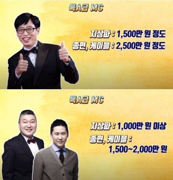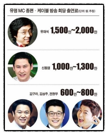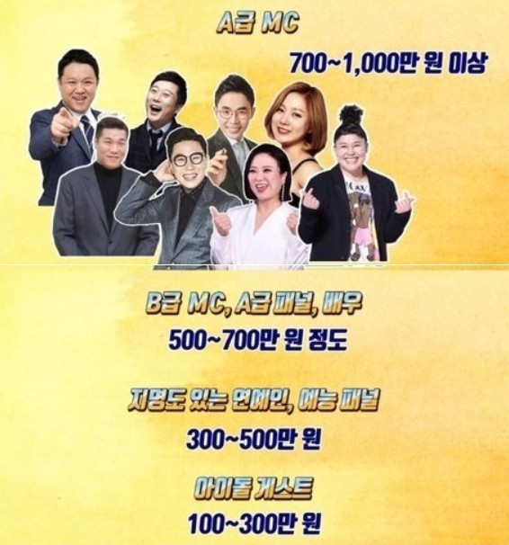 연예인별 회당 출연료, 연예인 회당 출연료, 연예인 회당 출연료, 유재석, 강호동, 신동엽, 김구라, 김성주, 전영무, A급, B급, 아이돌 출연료