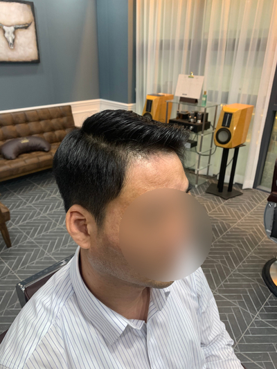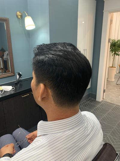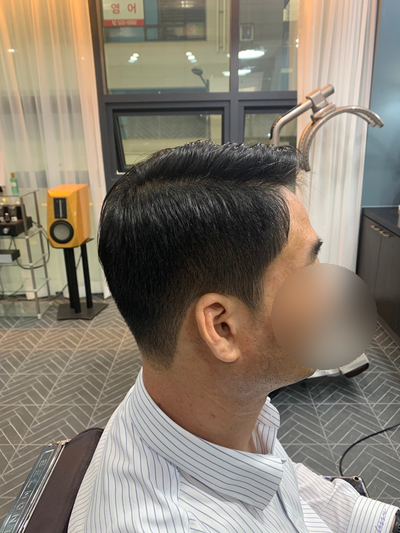 옆머리는 얼굴형과 두상에 맞게 일자형 또는 상고형으로 이루어집니다.이번 고객은 상고형으로 짧게 보이지 않도록 진행하겠습니다.