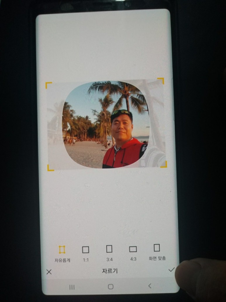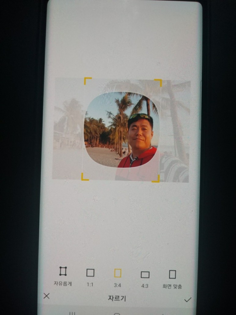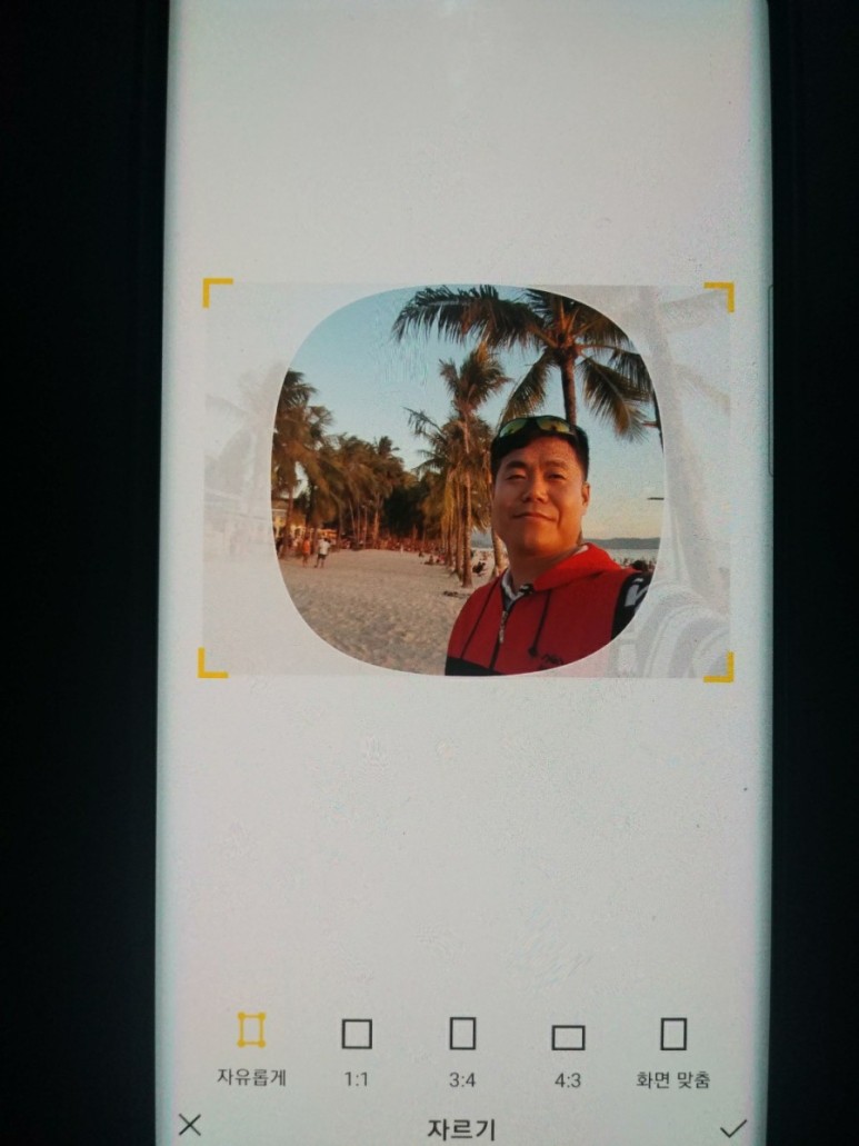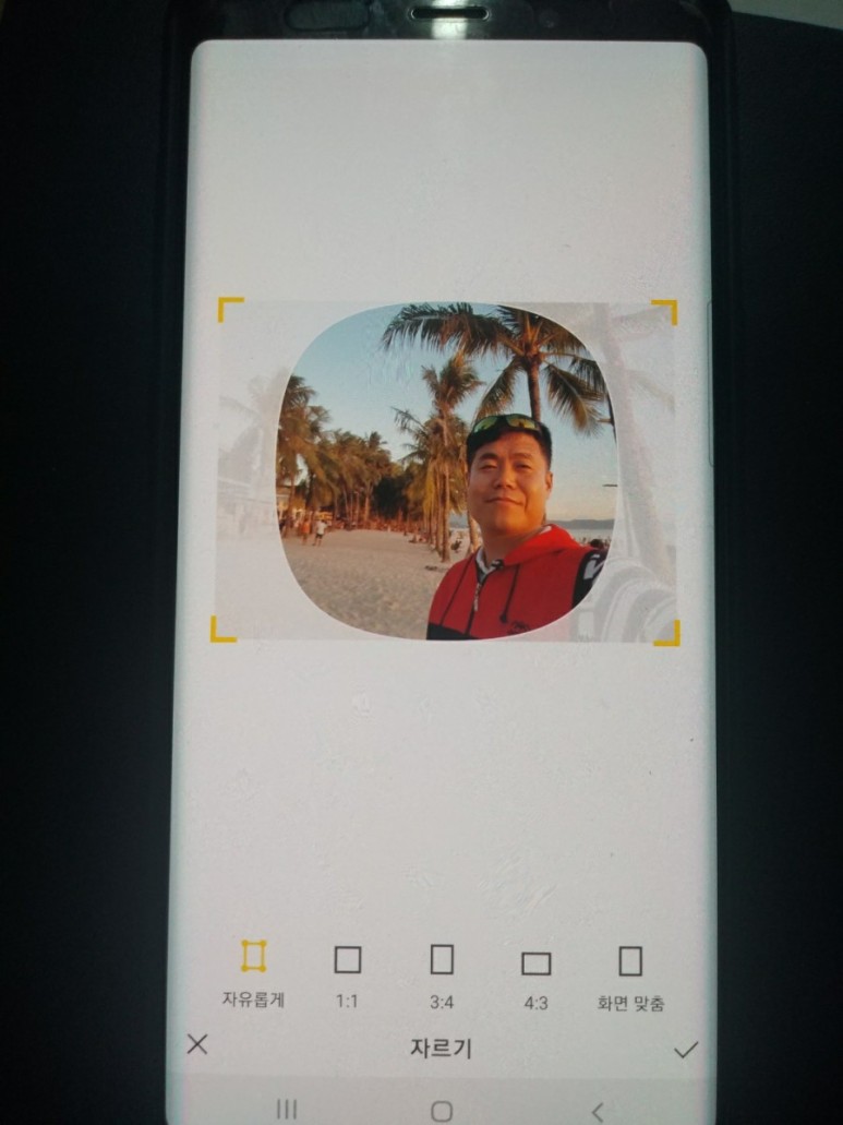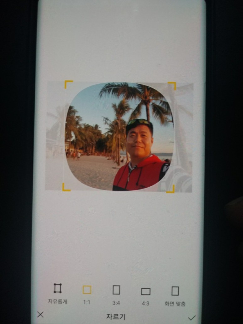 첫 번째로 사이즈 조절 가능한 기능이 ‘자유롭게’가 가장 왼쪽에 있고, 프로필 배경화면에 올라갈 사진 사이즈 조절이 표시됩니다.