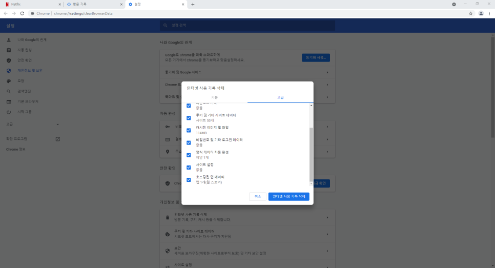 인터넷 사용 기록 삭제 쿠키 및 기타 사이트 데이터와 캐시 이미지 및 파일, 패스워드 및 기타 로그인 데이터, 자동 완성, 설정, 데이터 등을 모두 체크하고 인터넷 사용 기록 삭제 버튼을 눌러 보았다. 그 결과는?