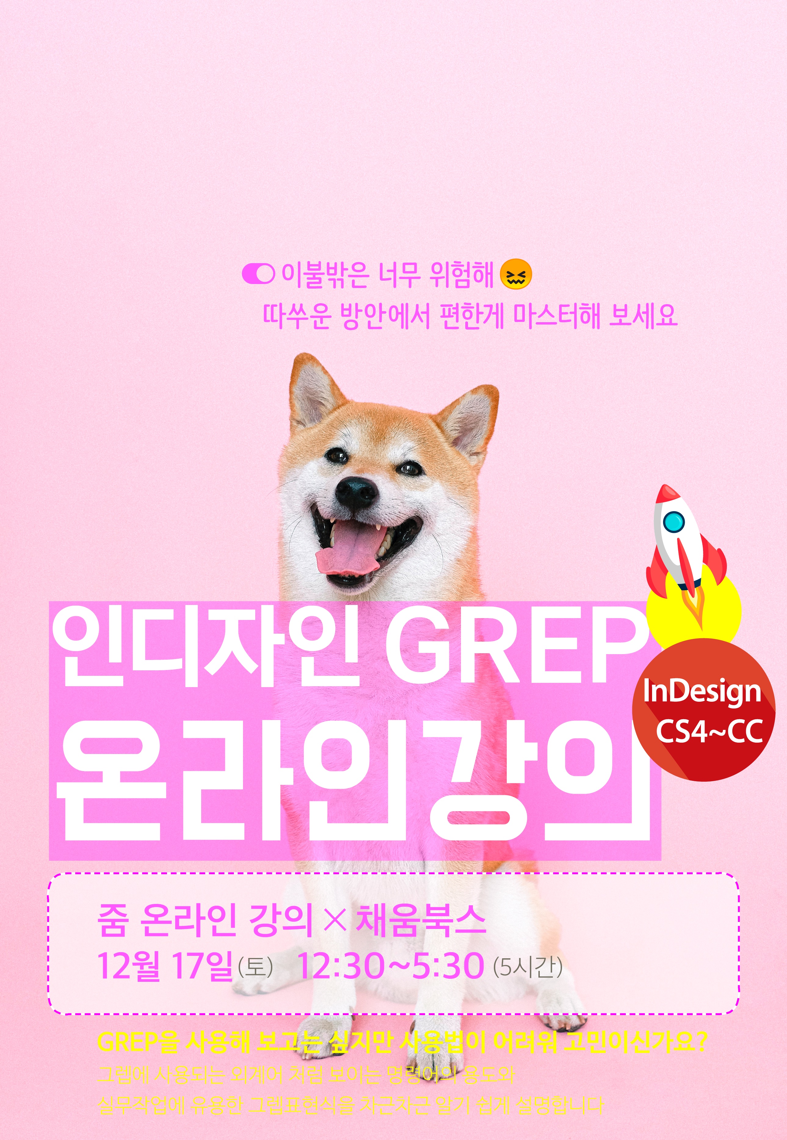 편집디자이너를 위한 인디자인 GREP 줌 온라인 강의 갑자기 추워진 날씨, 이불 밖은 추우니 따뜻한 방 안에서 편한 게 그렙을 마스터해보세요.