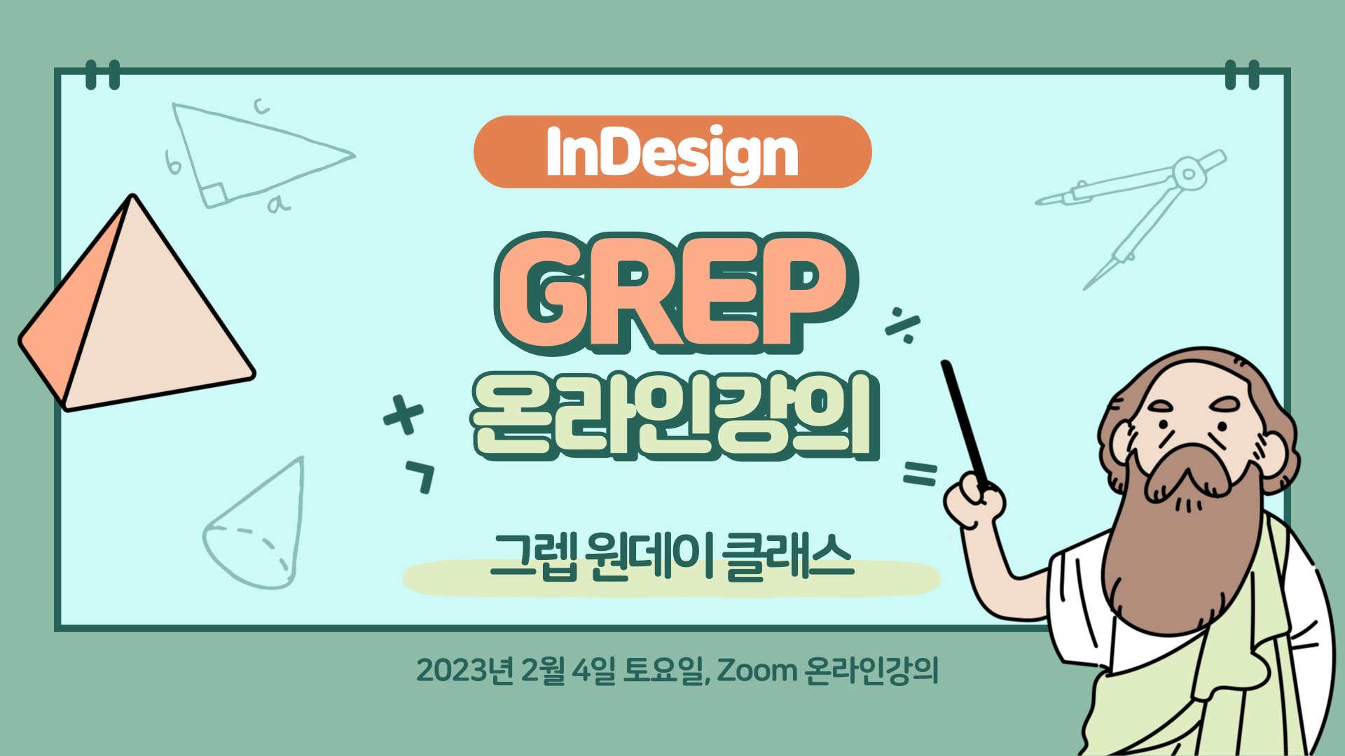 일시: 12월 17일 토요일 장소: 줌 줌 온라인 강의시간: 12:30 ~ 5:30 (5시간 강의) GREP란? 그렙은 반나절이 소요되는 수정작업을 10분만에 끝내는 데 도움이 되는 강력한 검색/교환 도구입니다.이번 One Day GREP 강의를 통해 인디자인 스킬을 레벨업 해보세요.단순 수정 작업이 놀라울 정도로 간단해집니다.강의 내용에는 그레브뿐만 아니라 겹쳐 입는 스타일의 사용법도 포함되어 있습니다.이런 분들께 추천드립니다.GREP을 사용해보고 싶지만 방법을 몰라서 고민중인 디자이너, 편집자, 프리랜서, 1인 출판 강의 신청 및 결제하러 가기