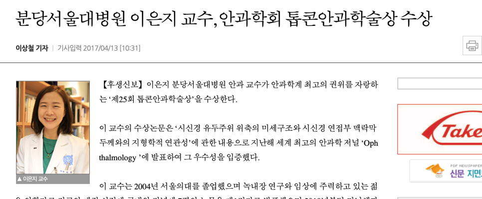 분당서울대병원을 기준으로 백내장은 어떤 의사가 제일 좋을까 했더니… 현진영 의사, 이은지 사이 쌍꺼풀이 됐으면 좋겠다현진영 의사는 서칭해 보면 저술 활동이 훌륭하고 이은지 의사는 저명한 학술상을 받은 경력이 있다. 아래와 같다고 한다