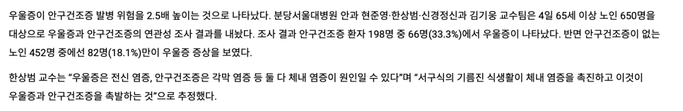 이 서울대병원에서 여러 가지 연구도 했는데 그중 하나가 안구건조증이었다. 나 요즘 안구건조증이 심한데 우울증 또는 염증 때문에 이런 현상이 생기기도 하는데 앞으로는 염증을 줄이는 식생활과 우울증을 개선하려고 노력해야겠다.