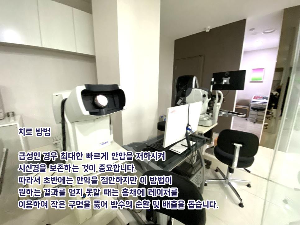 마지막으로 수술이 있는데 이것도 섬유주절제술과 방수유출장치 삽입술 두 가지로 나뉘고 전자는 전방과 결막 아래 공간 사이에 방수가 배출되는 출구를 형성하여 안압을 저하시키는 방법으로 치료를 합니다. 하지만 이미 손상된 시신경은 어떤 방법으로도 되돌릴 수 없기 때문에 그 질환은 초기에 빨리 발견하는 것이 관건이라는 점을 항상 염두에 두는 것이 좋습니다.