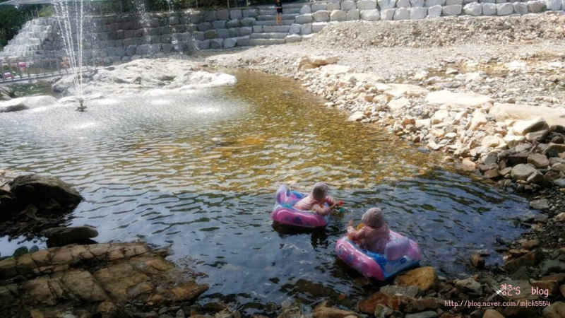 이렇게 수영장이 있어서 수심은 70~80cm 정도 됩니다. 물이 고여있는 형태가 아니라 오른쪽에서 왼쪽으로 흐르는 형태입니다. 물이 빠지는 곳마다 위치하고 있으며 물은 위에서 나옵니다. 어른보다는 아이들이 놀기 좋은 곳이에요.