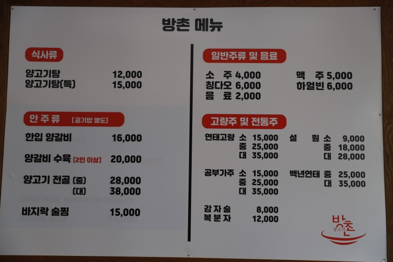 동탄 보양식을 먹으러 방촌양갈비를 방문하였습니다~ 방교리맛집 방촌양갈비입니다.양고기는 그냥 꼬치만 먹었는데 이렇게 또 다른 맛으로 맛볼 수 있다는 걸 처음 알았어요 (웃음) 어떤 메뉴가 있는지 매장 앞에도 메뉴가 있어서 메뉴를 확인할 수 있습니다.