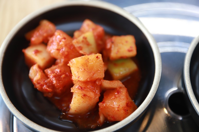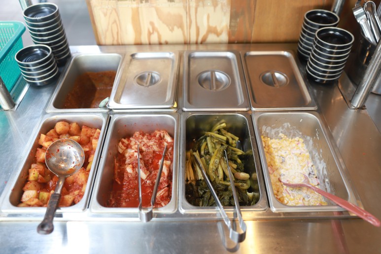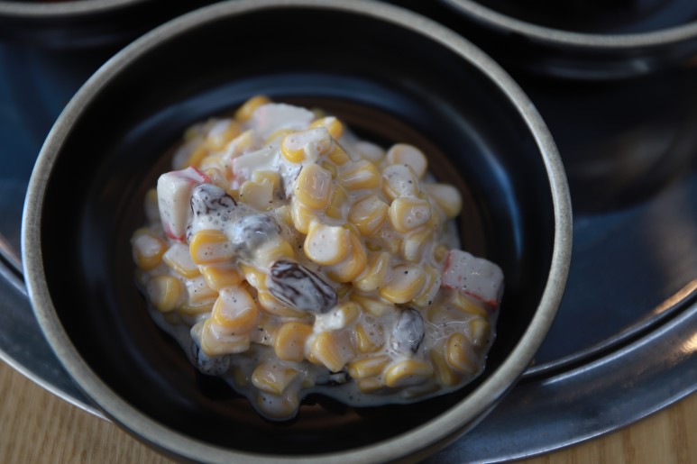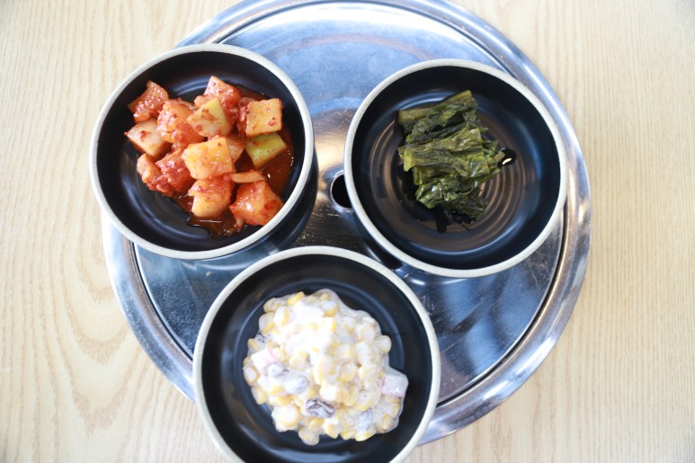 반찬은 이쪽이고 3가지가 있습니다.셀프바가 있기 때문에 리필하고 싶은 반찬은 갖다 먹을 수 있습니다.메뉴 나오기전에 옥수수 먹었는데 정말 맛있었어요^^다른 반찬은 식사하면서 먹기 좋았습니다.