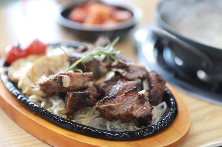 버섯이나 방울토마토, 밑에는 콩나물도 있고 고기뿐만 아니라 다양하게 먹을 수 있어요.위에 허브까지 플레이팅되어 예쁘고 맛깔스러운 한입의 양갈비입니다.맵지 않아서 아이들 반찬으로 좋아요~^^
