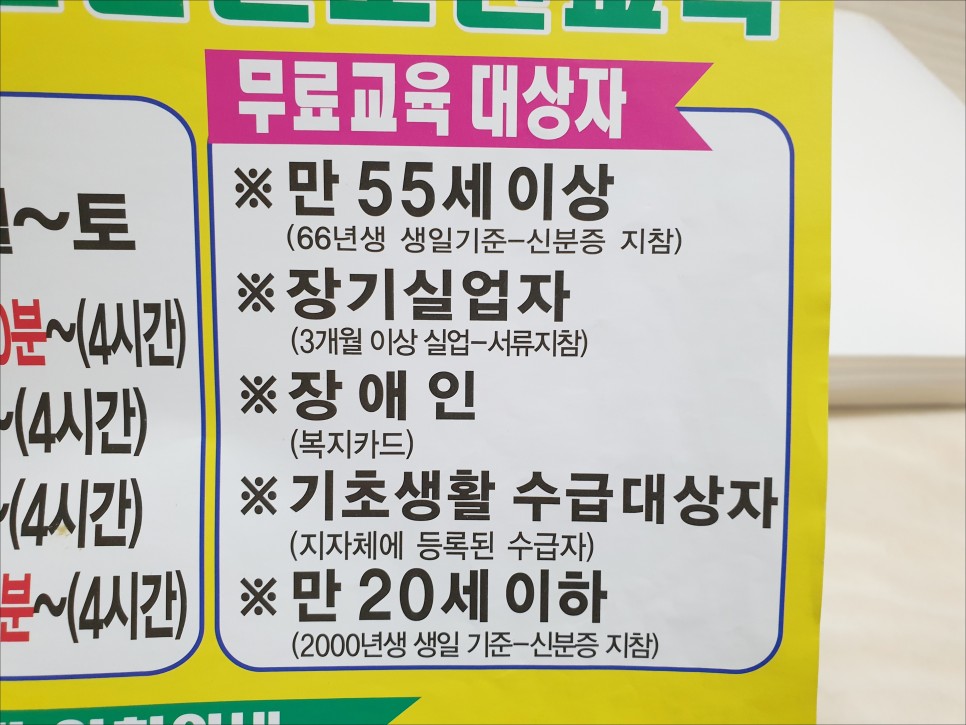 교육기관을 방문하자마자 눈에 띈 것은 2021년 취약계층 무료교육 대상자에 대한 안내였습니다.[장애인] [3개월 장기 실업자] [만 55세 이상] [만 20세 이하] [만 18세 미만] [기초 생활 수급자]취약계층 무료교육 대상 조건상 6가지 조건 중 하나를 충족해도 건설기초안전교육 이수증 취득에 드는 교육비를 면제 받을 수 있었습니다.