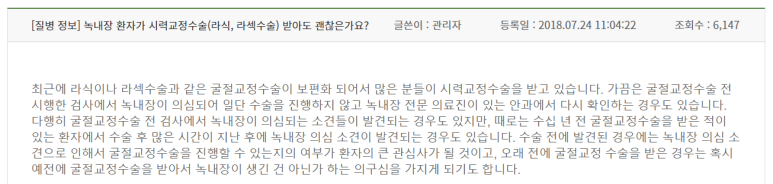 #2. 명확하게 녹내장 의심이나 고안압증이라면 라식과 라섹 모두 가능하지만 녹내장 전문의와의 세심한 상담이 필요합니다. 다만, 추후 녹내장 발생 가능성에 대한 정기적인 검진과 환자의 이해가 필요합니다.